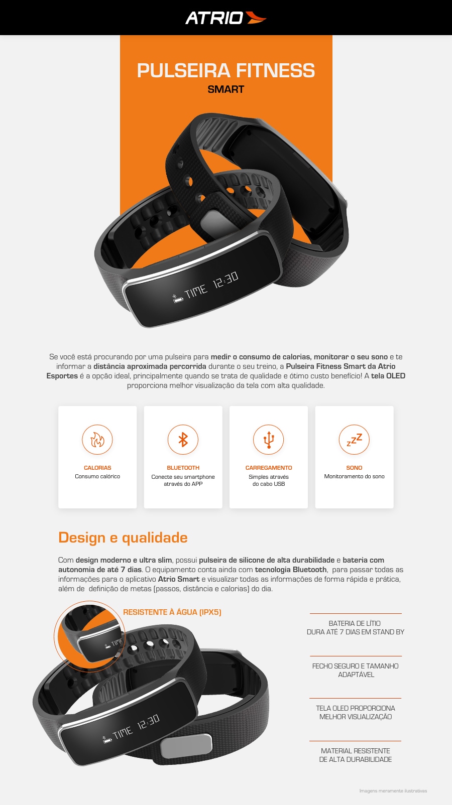 Uma pulseira inteligente que se alia à tecnologia para fazer parte das atividades esportivas com recursos que contribuem para o desempenho como medição do consumo de calorias, passos e distâncias aproximadas através do pedômetro, e ainda oferece o monitoramento do sono. Com alimentação por bateria de lítio, a Pulseira Inteligente Smart é em pulseira de silicone que se ajusta facilmente no pulso com tela de fácil visibilidade. Compatível com Bluetooth versão 4.0 e aplicativo gratuito para Android 4.4 e iOS 8.0, com a Pulseira Inteligente você pode se conectar ao seu smartphone, visualizando os indicadores de seu treino para maior praticidade. Não perca a chance e tenha a tecnologia como grande parceira e aliada em sua performance esportiva. Compre já!