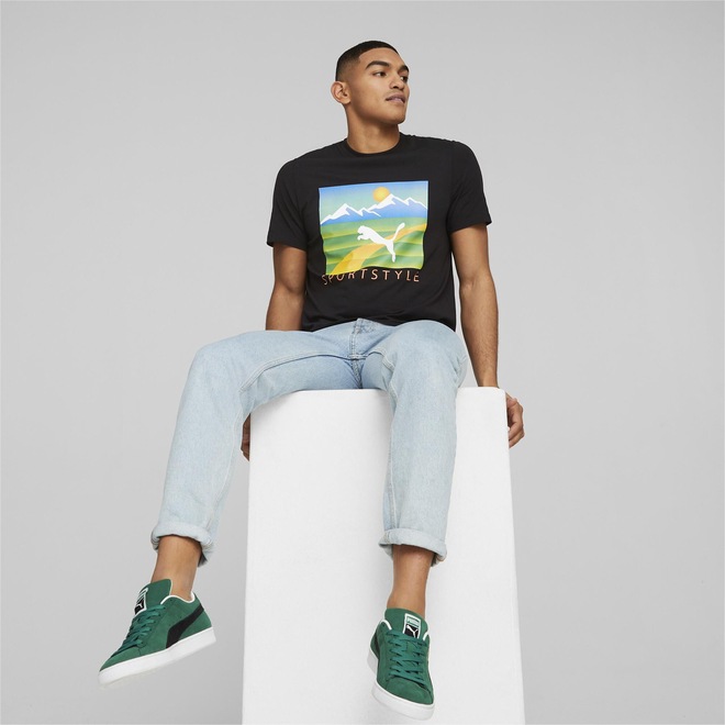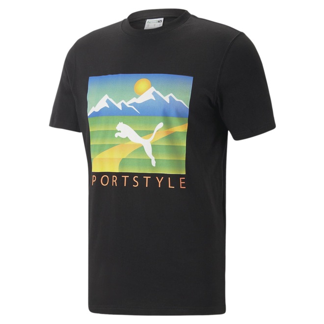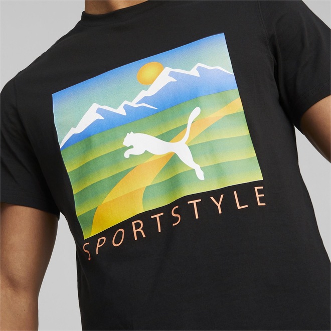 Aventure-se a explorar com a camiseta gráfica Outdoor Cat. Nosso logotipo PUMA Cat salta sobre uma paisagem natural no peito, trazendo esse visual esportivo e único.