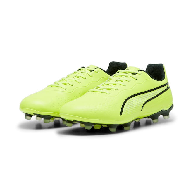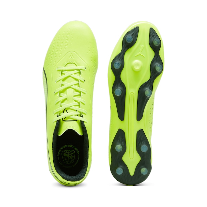 Controle de bola nunca foi tão confortável. Um ícone que resistiu ao teste do tempo por várias gerações, a chuteira KING retorna municiada com um design atraente e materiais inovadores que beneficiam tanto o jogador quanto o planeta. Isso inclui o novíssimo cabedal K-BETTER?, que reduz o impacto ambiental com conteúdo reciclado, ao mesmo tempo em que oferece uma sensação de conforto e elasticidade característicos. A sola leve com contraforte do calcanhar externo,estabilizador e travas cônicas proporcionam total liberdade de movimento para manter o controle da bola.