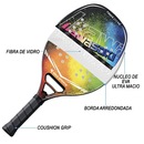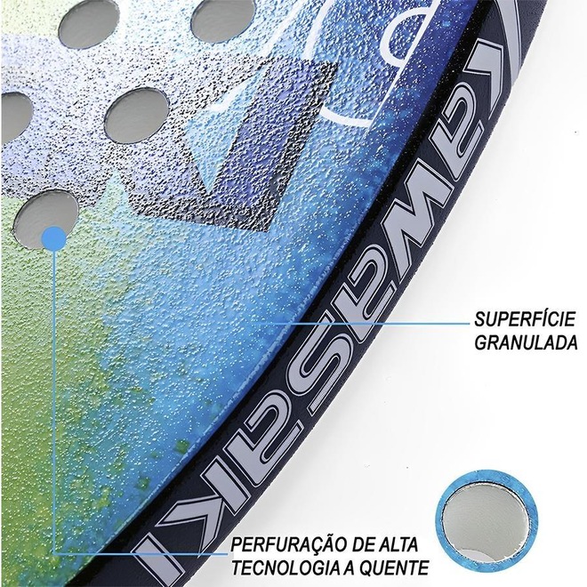 A Raquete Beach Tennis Gold Sports Power 211MC Kawasaki Carbon acompaha 2 Overgrip e 1 Capa, possui superfície granulada, bordas arredondadas e furos feitos com alta tecnologia a quente