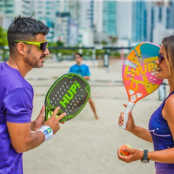 Raquete 3k Carbon da HUPI possui 320gramas, podendo variar até 330 gramas, peso considerado ótimo para quem pratica beach tennis.