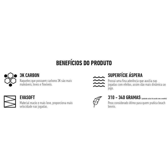 Raquete 3k Carbon da HUPI possui 320gramas, podendo variar até 330 gramas, peso considerado ótimo para quem pratica beach tennis.