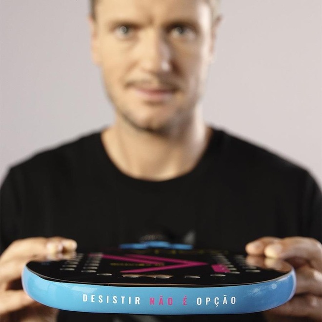 Desenvolvida em parceria com o jogador, a raquete tem carbono 3K premium, com fio de japonês, 22 mm e 27 furos.