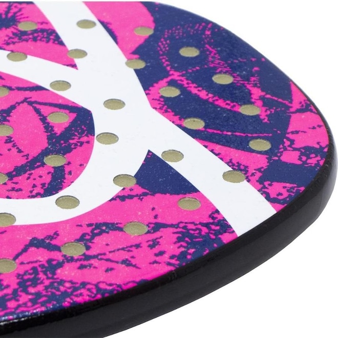 -Detalhamento: Raquete de Tênis de praia com cores vibrantes, superfície áspera e possui 51 furos dispostos na cabeça.