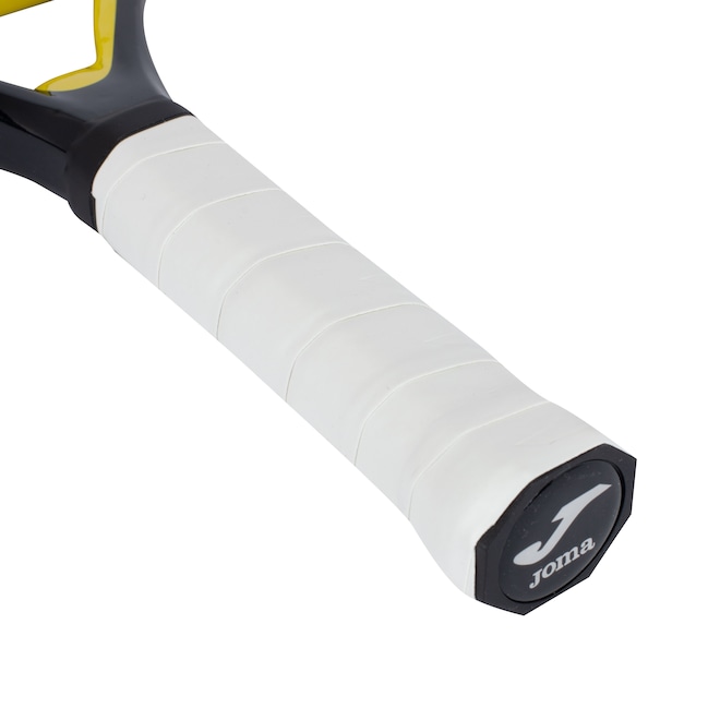 De nível iniciante a intermediário, a Raquete Joma é feita com face em fibra de vidro de alta flexibilidade que proporciona mais potência na batida, miolo em EVA SOFT que aumenta o controle sobre a batida gerando mais equilíbrio, além de textura áspera feita com jateamento de areia em 24 furos bem distribuídos que aumenta o grip e o coração da raquete.