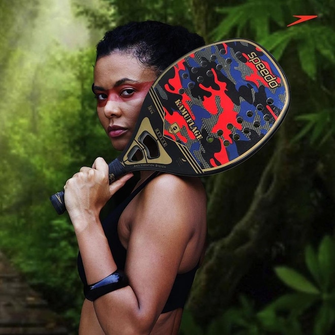 A SPEEDO Kamuflage vem acompanhada de uma exclusiva bolsa customizada, para que o atleta transporte com segurança e conforto até duas raquetes de Beach Tennis.
