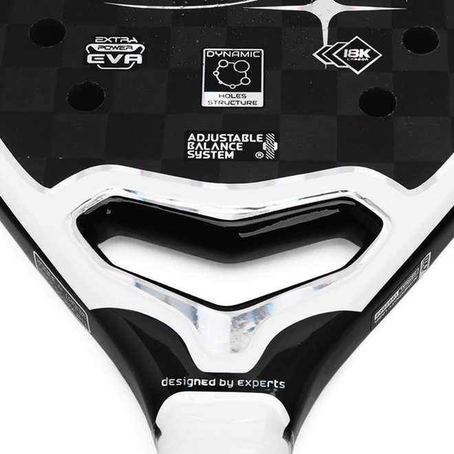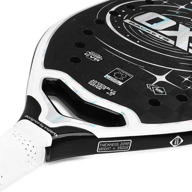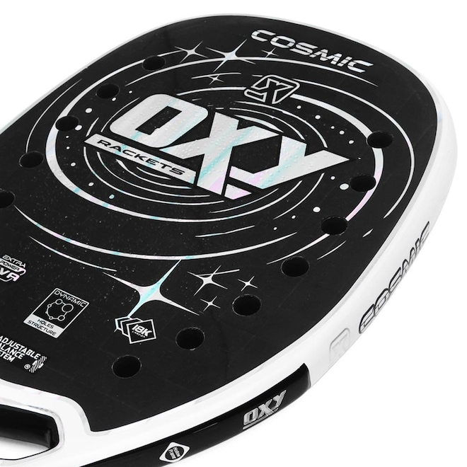 - Tecnologia: ADJUSTABLE BALANCE SYSTEM: As raquetes Oxy contam com o exclusivo Adjustable Balance System, tecnologia patenteada que permite ajustar o ponto de equilíbrio da raquete em tempo real. Através de um botão giratório no cabo, o jogador pode direcionar o peso para a cabeça (mais potência), para o cabo (mais controle) ou manter o equilíbrio central adaptando a raquete ao seu estilo e às demandas de cada partida. EVA EXTRA POWER: Espuma de baixa densidade com dureza entre 8 a 10 Shore, projetada para oferecer conforto, controle e excelente absorção de impacto. Ideal para jogadores que buscam precisão, suavidade nos golpes e menor vibração, sem abrir mão de durabilidade e desempenho consistente. DYNAMIC HOLES SYSTEM: Tecnologia de furação estratégica que amplia o sweet spot da raquete, garantindo performance consistente mesmo em golpes fora do centro. Melhora a estabilidade, reduz vibrações e oferece mais controle e potência durante o jogo. HOLLOW TUBE STRUCTURE: Utiliza uma estrutura tubular oca no quadro da raquete para aumentar resistência, estabilidade e controle, sem adicionar peso. Ideal para jogadores que buscam leveza, agilidade e alto desempenho em partidas intensas;