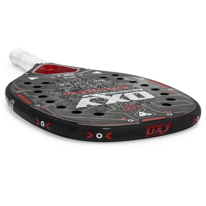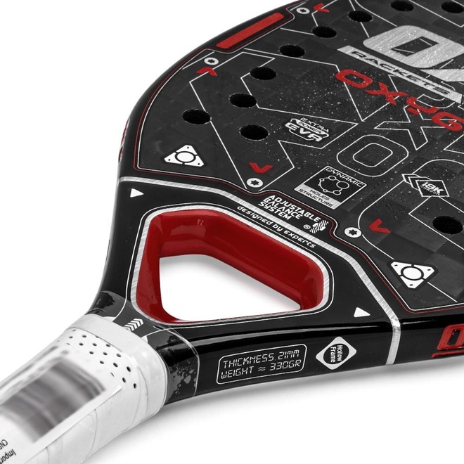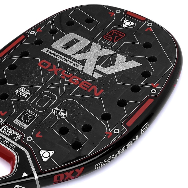 - Tecnologia: ADJUSTABLE BALANCE SYSTEM: As raquetes Oxy contam com o exclusivo Adjustable Balance System, tecnologia patenteada que permite ajustar o ponto de equilíbrio da raquete em tempo real. Através de um botão giratório no cabo, o jogador pode direcionar o peso para a cabeça (mais potência), para o cabo (mais controle) ou manter o equilíbrio central adaptando a raquete ao seu estilo e às demandas de cada partida. EVA EXTRA POWER: Espuma de baixa densidade com dureza entre 8 a 10 Shore, projetada para oferecer conforto, controle e excelente absorção de impacto. Ideal para jogadores que buscam precisão, suavidade nos golpes e menor vibração, sem abrir mão de durabilidade e desempenho consistente. DYNAMIC HOLES SYSTEM: Tecnologia de furação estratégica que amplia o sweet spot da raquete, garantindo performance consistente mesmo em golpes fora do centro. Melhora a estabilidade, reduz vibrações e oferece mais controle e potência durante o jogo. HOLLOW TUBE STRUCTURE: Utiliza uma estrutura tubular oca no quadro da raquete para aumentar resistência, estabilidade e controle, sem adicionar peso. Ideal para jogadores que buscam leveza, agilidade e alto desempenho em partidas intensas;
