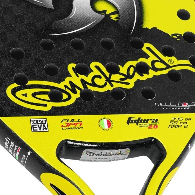 - Tecnologia: MULTI-HOLE com furos espalhados na região central da raquete, que facilitam a passagem de ar tornando os movimentos rápidos e leves e o exclusivo e patenteado FUTURA SYSTEM, um dispositivo tecnológico que permite uma redução consistente das vibrações causadas pelo impacto contínuo da bola, amenizando traumas do pulso, de cotovelo e de ombro, ao mesmo tempo em que mantém a raquete no mais alto nível de jogo. EVA Black alta densidade, para maior sensibilidade e excelente controle;