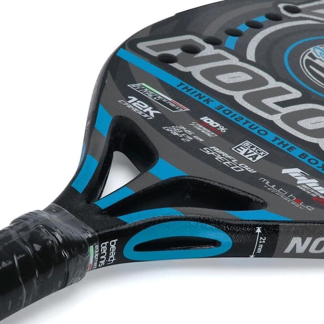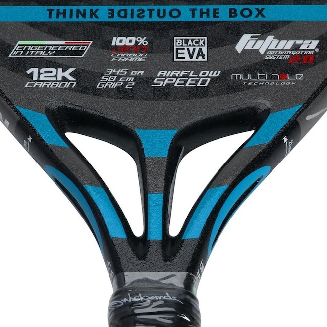 - Tecnologia: MULTI-HOLE com furos espalhados na região central da raquete, que facilitam a passagem de ar tornando os movimentos rápidos e leves e o exclusivo e patenteado FUTURA SYSTEM, um dispositivo tecnológico que permite uma redução consistente das vibrações causadas pelo impacto contínuo da bola, amenizando traumas do pulso, de cotovelo e de ombro, ao mesmo tempo em que mantém a raquete no mais alto nível de jogo.
