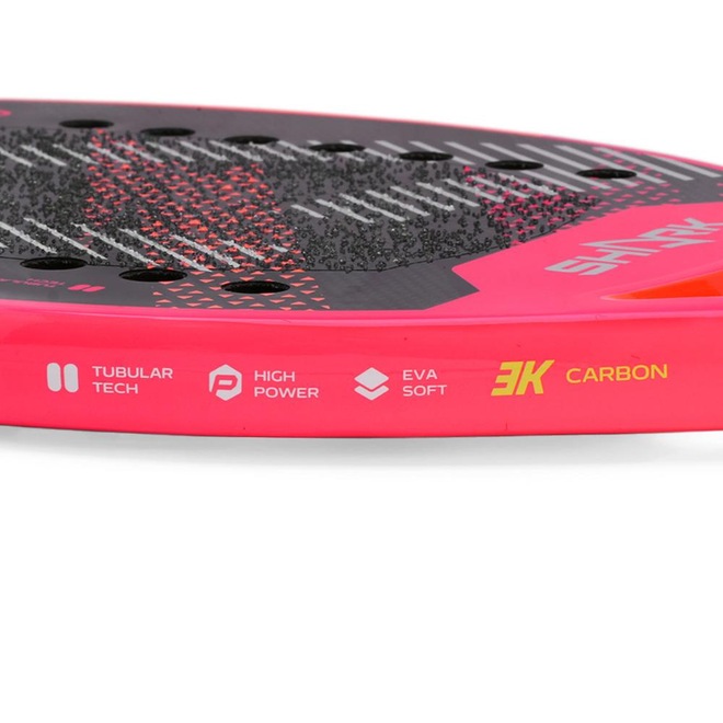 3K CARBON: material leve e resistente ajuda a aumentar a potência e a precisão da raquete; HIGH POWER: ajuda a aumentar a potência e o controle