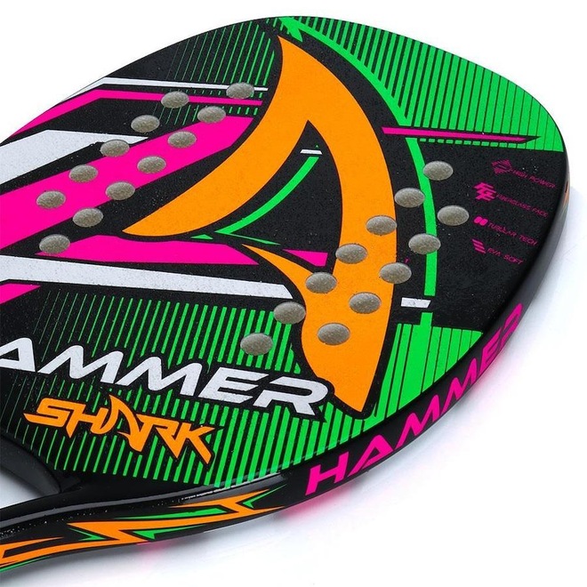 Descrição da Raquete de Beach Tennis Shark Hammer A Shark é uma das marcas referência no mundo do Beach Tennis, conta com uma ampla linha de raquetes de todos os níveis e sempre com excelente qualidade.Um exemplo disso é a Raquete de Beach Tennis Shark Hammer, ela foi desenvolvida com tecnologia EVA Soft.