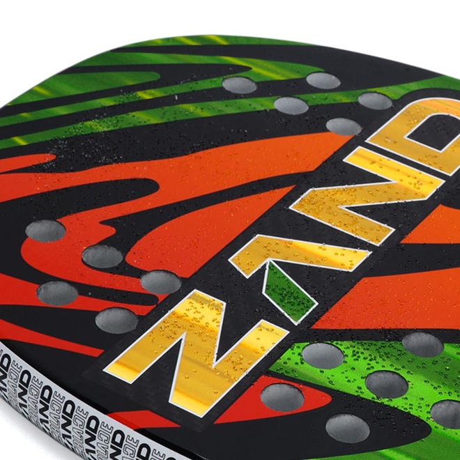 - Detalhamento: Possui tratamento áspero que ajuda a gerar efeitos, 24 furos, design moderno e diferenciado com detalhes em cores metalizadas brilhantes conferindo muito estilo à raquete, acompanha capa com alça ajustável;