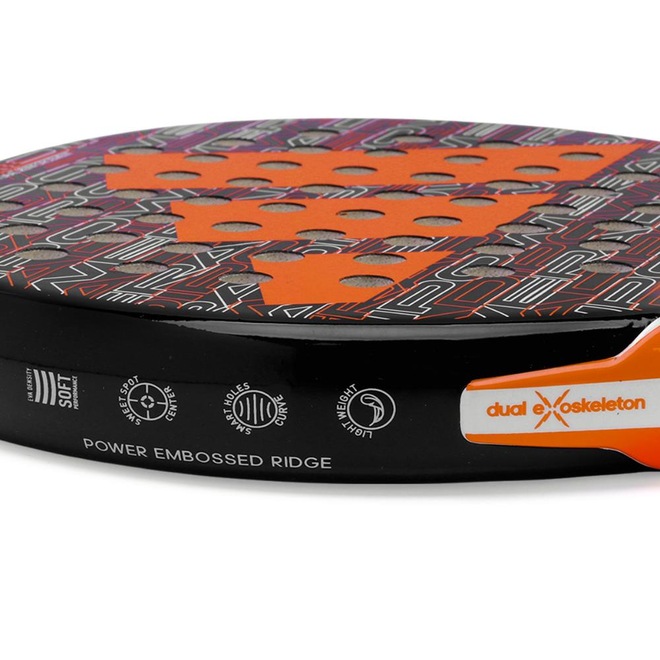 - Tecnologias: EXOSKELETON: A potência da raquete aumenta com sua rigidez. O reforço com nervos de carbono no centro e na estrutura ajuda a suportar melhor os impactos mais fortes. SMART HOLES CURVE: : Projetados para facilitar a geração de spin, oferecendo mais efeito nas jogadas. STRUCTURAL REINFORCEMENT: Uma tecnologia fundamental para alcançar a máxima potência. Os reforços que dispõe no perímetro da raquete aumentam a sua rigidez;