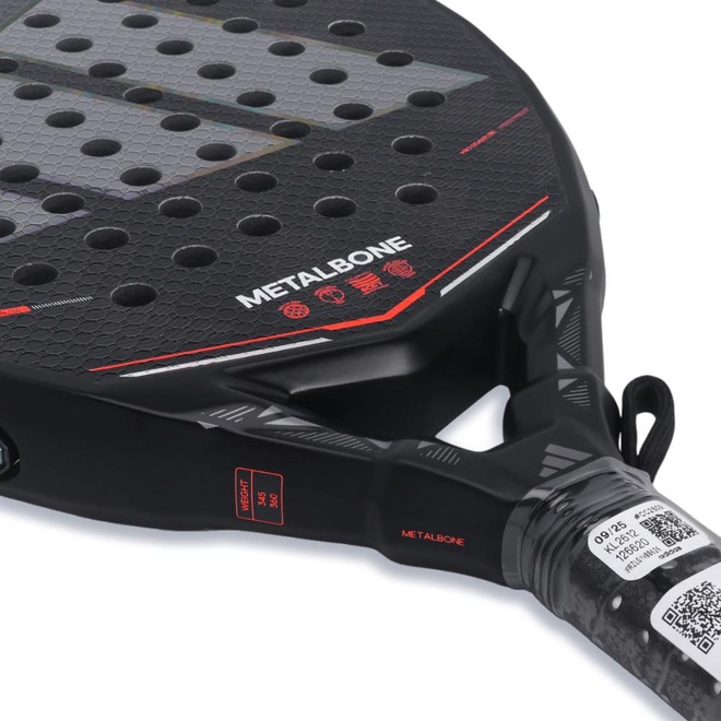 - Detalhamento: Superfície texturizada, possui 53 furos. Esta versão oferece a possibilidade de ajustar o peso e o equilíbrio conforme a preferência do jogador. Por meio de um sistema de parafusos, placas e anilhas removíveis localizadas nas laterais e na parte superior da estrutura, é possível modificar tanto o peso da raquete quanto sua distribuição em até 11,2g. Acompanha chave para tal ajuste. Alça de segurança no cabo;