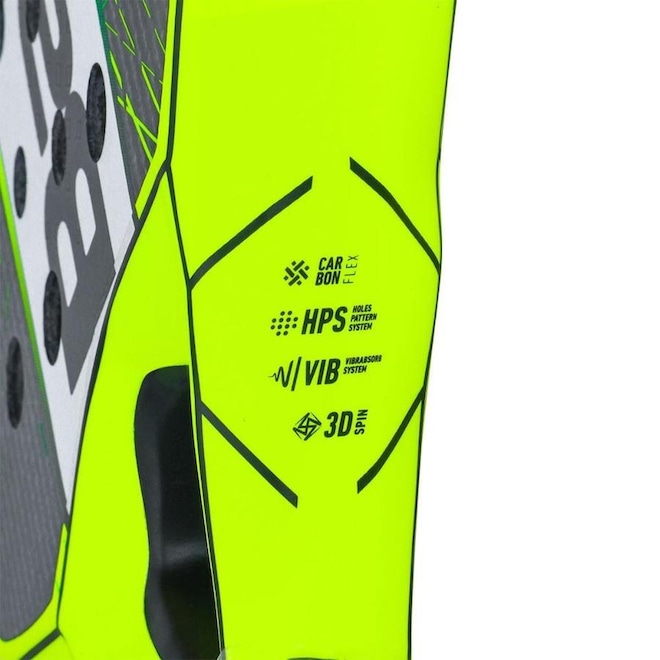 VIBRABSORB SYSTEM: Sistema permite uma melhor absorção das vibrações graças a um novo material elastómero integrado na grafite do núcleo da raquete que proporciona mais conforto em cada batida reduzindo o risco de lesão.