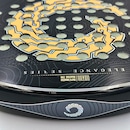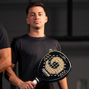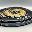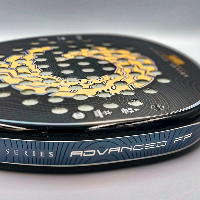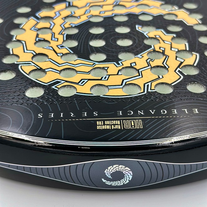 A face em Carbono 12K proporciona resposta firme e precisa no impacto, enquanto o núcleo em EVA Mid Soft White contribui para um toque mais macio e responsivo.