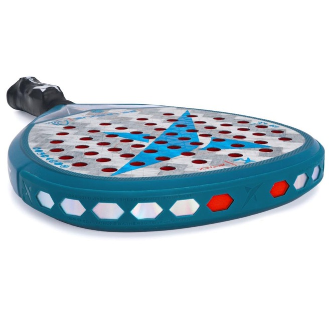 - Tecnologia: TWIN TUBULAR SYSTEM: Estrutura reforçada com tubos duplos de carbono para maior resistência e estabilidade estrutural. SMART HOLES SYSTEM: Distribuição otimizada dos furos para melhorar a aerodinâmica e os efeitos da bola. 3D FACE: Textura tridimensional exclusiva que melhora a aderência da bola e aprimora os efeitos nos golpes. ERGO PRO PROTECTOR: Protetor leve de nylon aderido à raquete, protegendo contra impactos sem perfurar a estrutura. VIBRA TECH ANGLES: Estrutura angular que reduz a transferência de vibrações para o braço do jogador. CORK CUSHION GRIP: Sistema anti-vibração com lâmina de cortiça na empunhadura para maior absorção de impacto. POWER BEAM HEART: Estrutura reforçada no coração da raquete, proporcionando maior rigidez e estabilidade nos golpes;