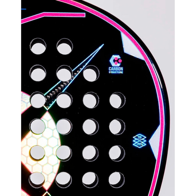 A face é feita em carbono 3k, enquanto o núcleo interno é feito com EVA SUPER SOFT BLACK, oferecendo uma excelente sensação de toque. A estrutura 100% carbono assegura resistência e durabilidade, fazendo da PREDATOR PWR uma escolha perfeita para jogadoras exigentes que buscam combinar estética e funcionalidade em um único produto.