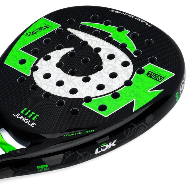 - Tecnologias: Asymmetric Heart Evo: Mantém o design assimétrico característico da LÕK e ganha uma peça central verde que reforça a estrutura, aumentando a estabilidade e reduzindo vibrações para mais conforto. O design da peça inclui uma abertura funcional que pode ser usada para abrir garrafas. Flex Fiber: Carbono misto em três planos diferentes para obter a flexibilidade adequada. Comfort Wristband: Alça de punho ajustável que se adapta às preferências do jogador. Carbon Reinforcement: Reforços de carbono aplicados em áreas estratégicas da raquete que aumentam a resistência estrutural;
