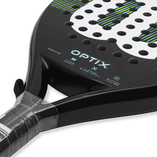 - Detalhamento: Estrutura em fibra de vidro trançada que garante estabilidade e resposta rápida, com núcleo de espuma de baixa densidade para mais potência e toque macio. O formato arredondado favorece contatos consistentes, enquanto a perfuração avançada aumenta a aderência em cada golpe. Acompanha cordão de pulso, superfície lisa com 71 furos.