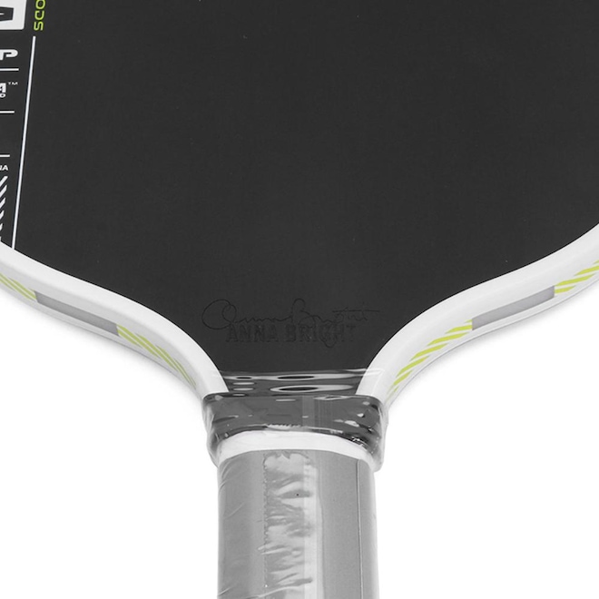 - Detalhamento: A raquete apresenta um acabamento preto fosco elegante, com detalhes em branco e amarelo conferindo um visual arrojado e contemporâneo. A escrita da marca reforça a identidade, e a assinatura de Anna Bright próxima à base acrescenta um toque exclusivo. O produto é certificado pela USAP PBCoR 43 e pela UPA-A. A cabeça da raquete possui o formato arredondado é um dos diferenciais desta raquete. Ele contribui para um ponto de impacto mais amplo (sweet spot), oferecendo maior tolerância em batidas fora do centro e melhor sensação de controle nas trocas rápidas. O cabo é revestido com uma fita de grip branca, garantindo uma pegada confortável e segura durante o jogo;