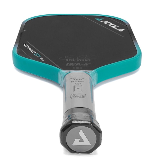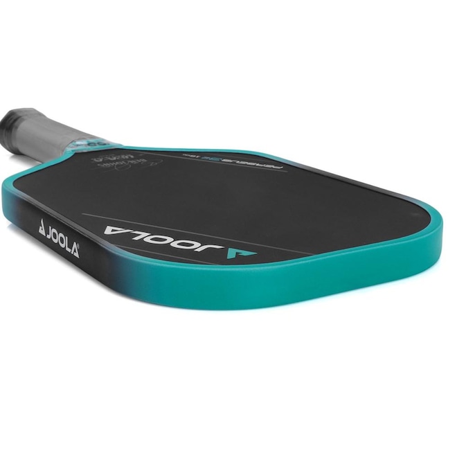 - Detalhamento: A raquete apresenta um design moderno e sofisticado, na cor preta com bordas em tom vibrante de azul, que trazem um visual energético. A escrita "JOOLA" está em destaque no canto superior direito e nas bordas, reforçando a identidade da marca, enquanto a escrita "Perseus 3S 16mm" aparece na base do lado esquerdo, ao lado da assinatura centralizada de Ben Johns. É certificada pela UPA-A (United Pickleball Association). A face é levemente áspera e o cabo é envolto em uma fita preta que proporciona boa aderência e conforto na pegada;