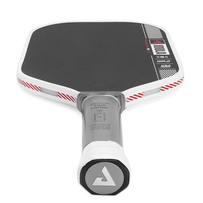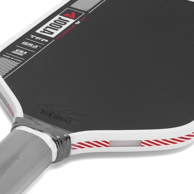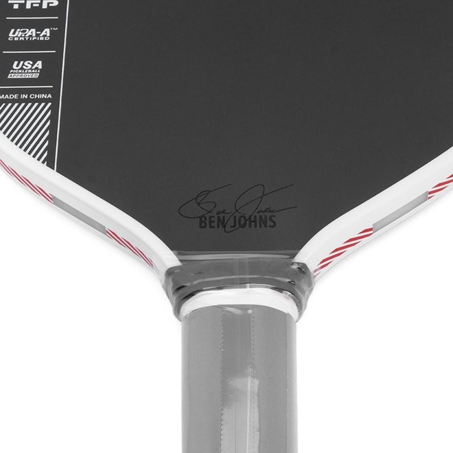 - Detalhamento: A raquete apresenta um acabamento preto fosco elegante, com detalhes em branco e vermelho, conferindo um visual arrojado e contemporâneo. A escrita da marca reforça a identidade, e a assinatura de Ben Johns próxima à base acrescenta um toque exclusivo. O produto é certificado pela USAP PBCoR 43 e pela UPA-A. A cabeça da raquete possui formato retangular com cantos arredondados, oferecendo uma área ampla para golpes mais precisos e com maior controle. O cabo é revestido com uma fita de grip branca, garantindo uma pegada confortável e segura durante o jogo;