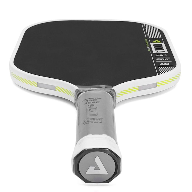 - Detalhamento: A raquete apresenta um acabamento preto fosco elegante, com detalhes em branco e amarelo conferindo um visual arrojado e contemporâneo. A escrita da marca reforça a identidade, e a assinatura de Collin Johns próxima à base acrescenta um toque exclusivo. O produto é certificado pela USAP PBCoR 43 e pela UPA-A. A cabeça da raquete possui o formato arredondado é um dos diferenciais desta raquete. Ele contribui para um ponto de impacto mais amplo (sweet spot), oferecendo maior tolerância em batidas fora do centro e melhor sensação de controle nas trocas rápidas. O cabo é revestido com uma fita de grip branca, garantindo uma pegada confortável e segura durante o jogo;