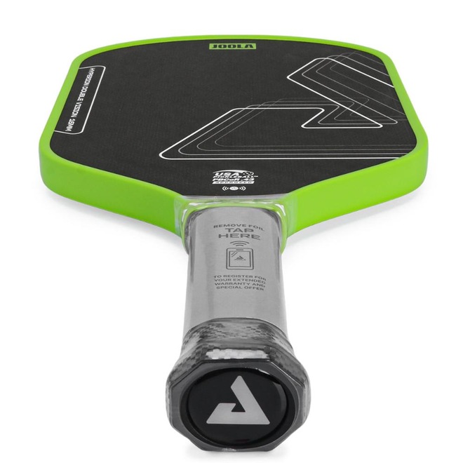 - Detalhamento: Superfície em fibra de carbono aramida que garante alta durabilidade com toque suave e responsivo. Design aerodinâmico curvo no topo para para velocidade e precisão. O chip NFC integrado no cabo permite que o jogador registre a raquete de forma rápida e prática. Basta aproximar o celular da área indicada para acessar o sistema de registro oficial da Joola, garantindo autenticidade e suporte do fabricante. O produto é certificado pela USAP PBCoR 43;