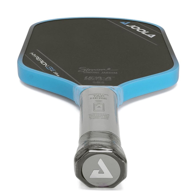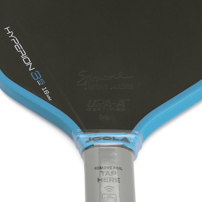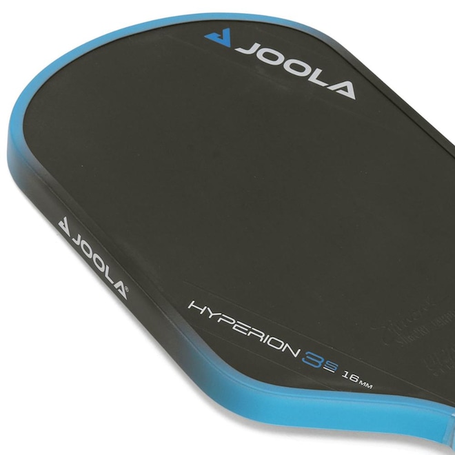 - Detalhamento: A raquete apresenta um design moderno e sofisticado, na cor preta com bordas em tom vibrante de azul, que trazem um visual energético. A escrita "JOOLA" está em destaque no canto superior direito e nas bordas, reforçando a identidade da marca, enquanto a escrita "Hyperion 3S 16mm" aparece na base do lado esquerdo, ao lado da assinatura centralizada de Simone Jardim. É certificada pela UPA-A (United Pickleball Association). A face é levemente áspera e o cabo é envolto em uma fita preta que proporciona boa aderência e conforto na pegada;
