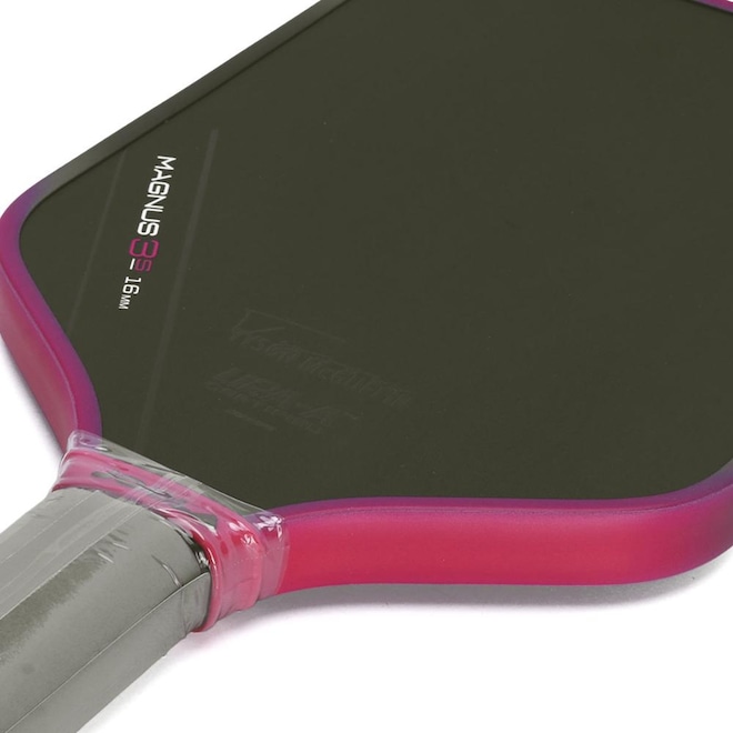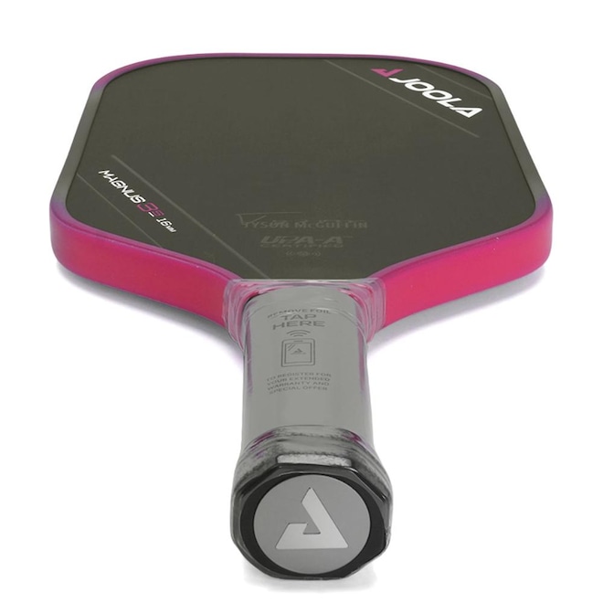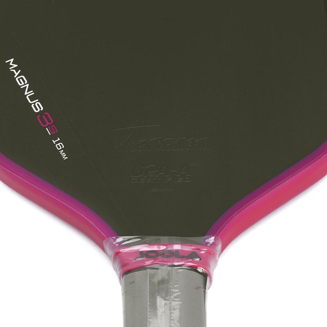 - Detalhamento: A raquete apresenta um design moderno e sofisticado, na cor preta com bordas em tom vibrante de rosa, que trazem um visual energético. A escrita "JOOLA" está em destaque no canto superior direito e nas bordas, reforçando a identidade da marca, enquanto a escrita "Magnus 3S 16mm" aparece na base do lado esquerdo, ao lado da assinatura centralizada de Tyson McGuffin. É certificada pela UPA-A (United Pickleball Association). A face é levemente áspera e o cabo é envolto em uma fita preta que proporciona boa aderência e conforto na pegada;