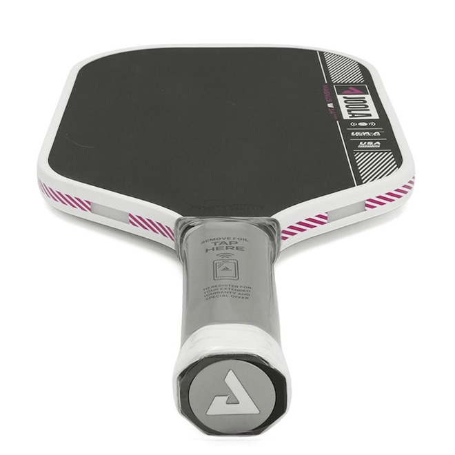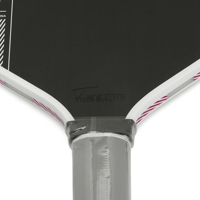 - Detalhamento: A raquete apresenta um acabamento preto fosco elegante, com detalhes em branco e rosa conferindo um visual arrojado e contemporâneo. A escrita da marca reforça a identidade, e a assinatura de Tyson McGuffin próxima à base acrescenta um toque exclusivo. O produto é certificado pela USAP PBCoR 43 e pela UPA-A. A cabeça da raquete possui o formato levemente arredondado mais longo combinada com um cabo mais curto para maior potência e alcance. O cabo é revestido com uma fita de grip branca, garantindo uma pegada confortável e segura durante o jogo;