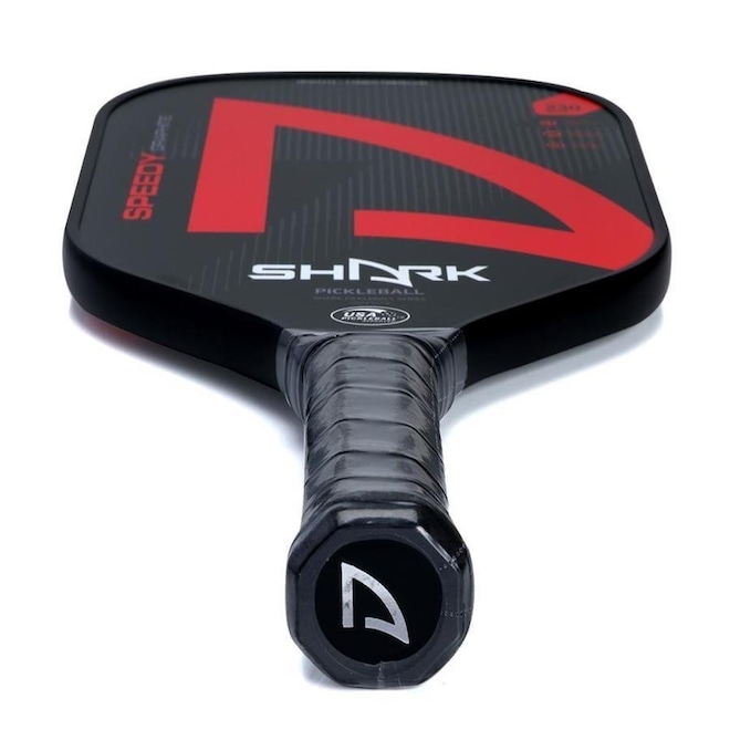 Conheça as características da Raquete De Pickleball Shark Speedy - Perfil: Pickleball - Composição: Grafite + Carbono e Fibra de vidro - Tecnologia: High Power Technology, nucleo Polymer Honeycomb Core e Central Sweet Spot Optimized - Face: Liso - Peso aproximado: 230g - Comprimento: 40,8cm - Espessura: 13mm - Largura: 20cm - Comprimento Punho: 12,7cm - Detalhamento: Raquete de Pickleball com o logo estampado em evidencia, escrita Shark, empunhadura emborrachada e confortável.