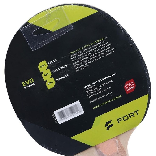 Descrição da Raquete de Tênis de Mesa Fort Evo A Fort é uma marca desenvolvida para atender os apaixonados por esporte. Possui uma linha de produtos para Padel, equipamentos para Tênis de Mesa, Badminton entre outros, tal como uma ampla gama de acessorios complementares para sua performance, como munhequeiras, joelheiras, tornozeleiras e muito mais. Vem crescendo fortemente no ramo esportivo trazendo produtos de qualidade proporcionando aos atletas um melhor desempenho. Um exemplo disso é a Raquete de Tênis de Mesa Fort Evo que garante uma durabilidade maior e uma experiência de jogo agradável e satisfatória. Conheça as características da Raquete de Tênis de Mesa Fort Evo - Perfil: Tênis de Mesa - Nível Iniciante; - Material: Madeira 5V; - Esponja: 1,0mm; - Cabo: Concave; - Características: 53% velocidade; 93% controle; 43% efeito; - Peso: 153gr; - Cabeça: com proteção emborrachada em ambos os lados; - Medidas: 25cm X 15cm X 1.0cm - Origem: Importado.ref: M0ZL19