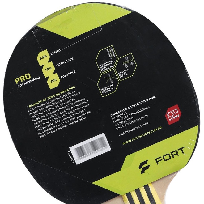 Descrição da Raquete de Tênis de Mesa Fort Pro A Fort é uma marca desenvolvida para atender os apaixonados por esporte. Possui uma linha de produtos para Padel, equipamentos para Tênis de Mesa, Badminton entre outros, tal como uma ampla gama de acessorios complementares para sua performance, como munhequeiras, joelheiras, tornozeleiras e muito mais. Vem crescendo fortemente no ramo esportivo trazendo produtos de qualidade proporcionando aos atletas um melhor desempenho. Um exemplo disso é a Raquete de Tênis de Mesa Fort Pro que garante uma durabilidade maior e uma experiência de jogo agradável e satisfatória. Conheça as características da Raquete de Tênis de Mesa Fort Pro - Perfil: Tênis de Mesa - Nível Intermediário; - Material: Madeira 5V; - Esponja: 1,0mm; - Cabo: Concave; - Características: 73% velocidade; 71% controle; 53% efeito; - Peso: 178gr; - Cabeça: com proteção emborrachada em ambos os lados; - Medidas: 25cm X 15cm X 1.0cm - Origem: Importado.ref: M0ZL16