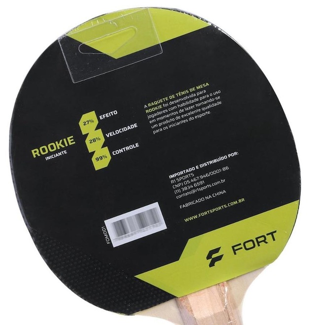 Descrição da Raquete de Tênis de Mesa Fort Rookie A Fort é uma marca desenvolvida para atender os apaixonados por esporte. Possui uma linha de produtos para Padel, equipamentos para Tênis de Mesa, Badminton entre outros, tal como uma ampla gama de acessorios complementares para sua performance, como munhequeiras, joelheiras, tornozeleiras e muito mais. Vem crescendo fortemente no ramo esportivo trazendo produtos de qualidade proporcionando aos atletas um melhor desempenho. Um exemplo disso é a Raquete de Tênis de Mesa Fort Rookie que garante uma durabilidade maior e uma experiência de jogo agradável e satisfatória. Conheça as características da Raquete de Tênis de Mesa Fort Rookie - Perfil: Tênis de Mesa - Nível Iniciante; - Material: Madeira 5V; - Esponja: 1,0mm; - Cabo: Concave; - Características: 28% velocidade; 99% controle; 27% efeito; - Peso: 135gr; - Cabeça: com proteção emborrachada em ambos os lados; - Medidas: 25cm X 15cm X 1.0cm - Origem: Importado.ref: M0ZL18
