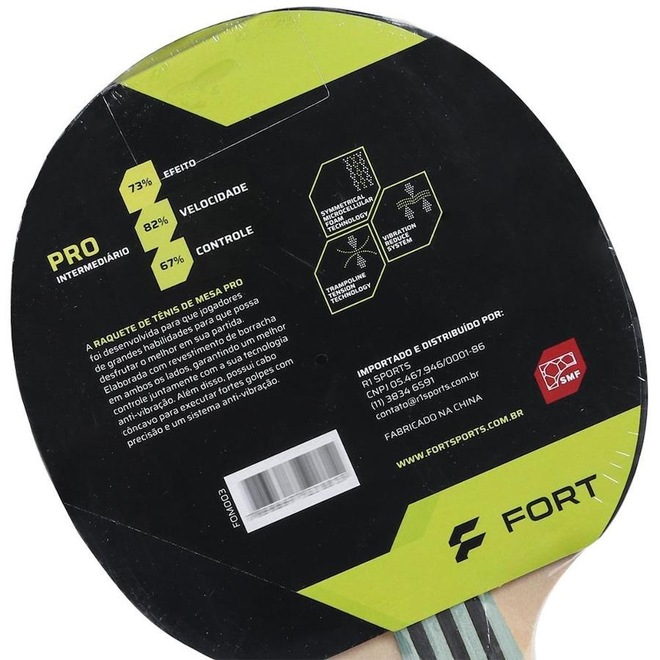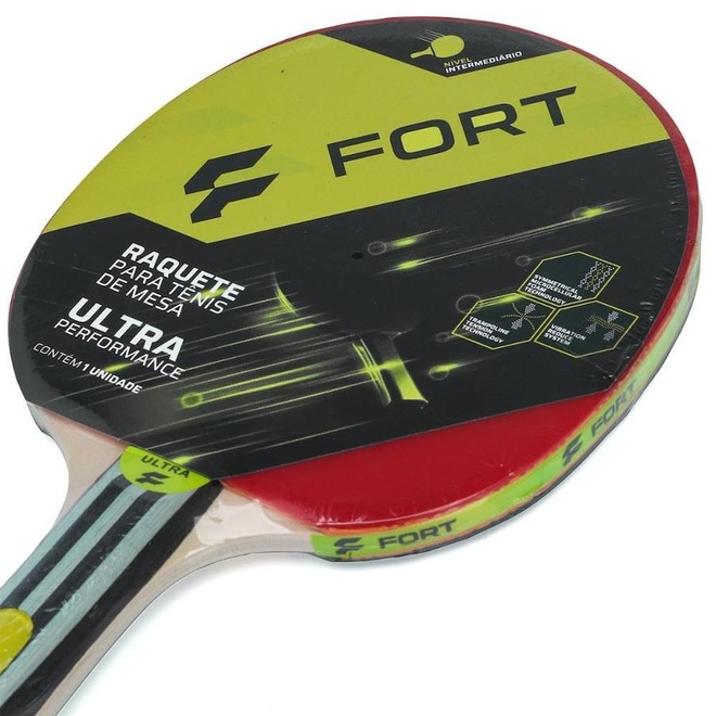Descrição da Raquete de Tênis de Mesa Fort Ultra A Fort é uma marca desenvolvida para atender os apaixonados por esporte. Possui uma linha de produtos para Padel, equipamentos para Tênis de Mesa, Badminton entre outros, tal como uma ampla gama de acessorios complementares para sua performance, como munhequeiras, joelheiras, tornozeleiras e muito mais. Vem crescendo fortemente no ramo esportivo trazendo produtos de qualidade proporcionando aos atletas um melhor desempenho. Um exemplo disso é a Raquete de Tênis de Mesa Fort Ultra que garante uma durabilidade maior e uma experiência de jogo agradável e satisfatória. Conheça as características da Raquete de Tênis de Mesa Fort Ultra - Perfil: Tênis de Mesa - Nível Intermediário; - Material: Madeira 5V; - Esponja: 1,0mm; - Cabo: Concave; - Características: 82% velocidade; 67% controle; 73% efeito; - Peso: 170gr; - Cabeça: com proteção emborrachada em ambos os lados; - Medidas: 25cm X 15cm X 1.0cm - Origem: Importado.ref: M0ZL14