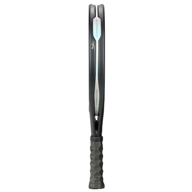 Canal de ar no coração da raquete que melhora a aerodinâmica, reduz peso e aumenta a velocidade de execução, reforçando também a integridade estrutural.