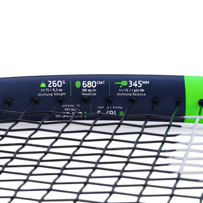 Um dos destaques desta versão é o Woofer System, tecnologia que melhora a interação entre o aro e as cordas, aumentando o tempo de contato da bola com a raquete. Isso se traduz em mais controle nos golpes e menor impacto no braço, especialmente útil em longas sessões de treino ou partidas casuais.