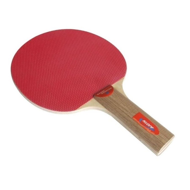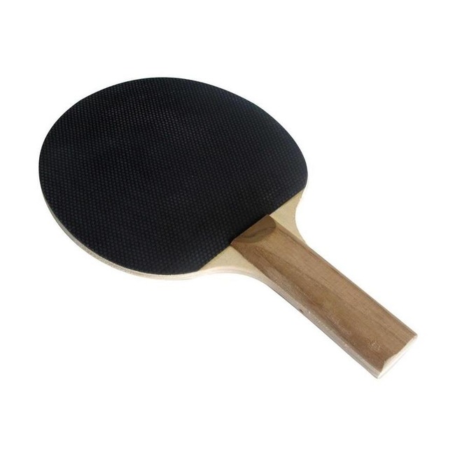 Esse modelo tem empunhadura clássica e é confeccionado em madeira, com ambos os lados revestidos por borracha pinada lisa, que garante o efeito nas jogadas.