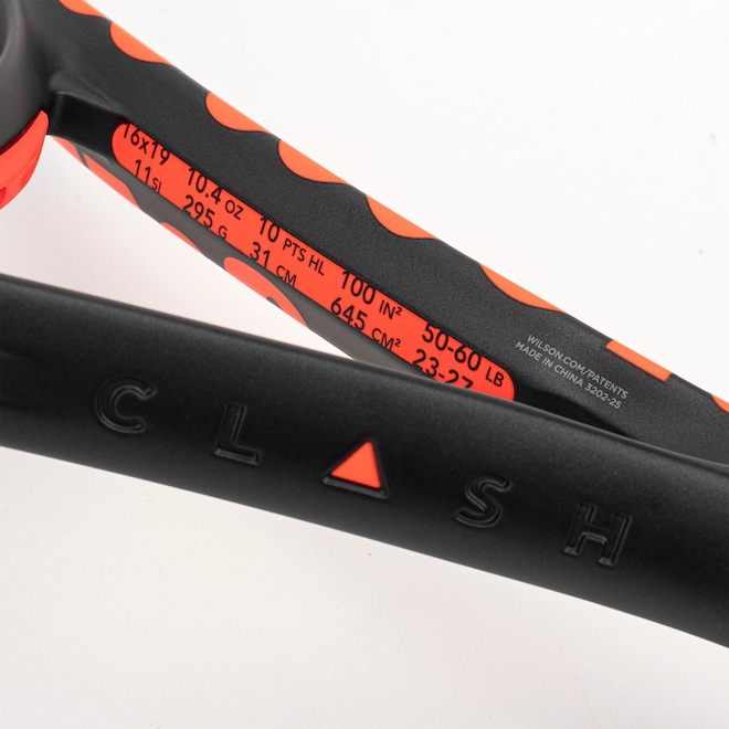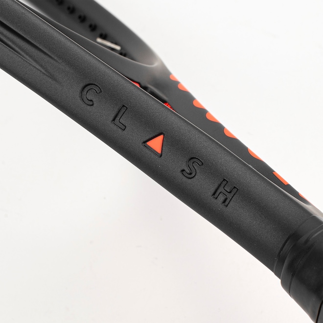 O logo Clash em relevo no pescoço finaliza o visual icônico da raquete com um toque elegante voltado à performance.