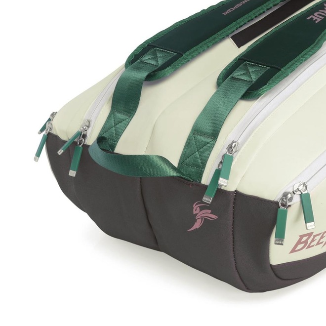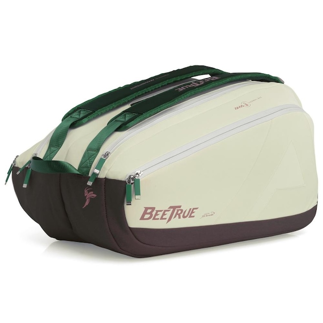 - Detalhamento: Raqueteira dupla com dois compartimentos principais com fechamento em zíper sendo um com proteção térmica que juntos comportam até 9 raquetes de beach tennis sem capa ou 5 raquetes de padel sem capa. Mais dois compartimentos menores com divisórias para boa organização de acessórios. Tecido lateral e superior em Couro PU Premium com toque suave e base em couro antiderrapante que garante alta durabilidade e resistência à sujeira, alças com regulagem e acolchoadas para transporte no ombro ou como mochila, além da alça de mão. Escrita BeeTrue em ambos os lados e assinatura da jogadora Eva Fernandez;