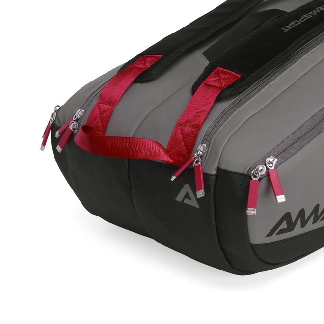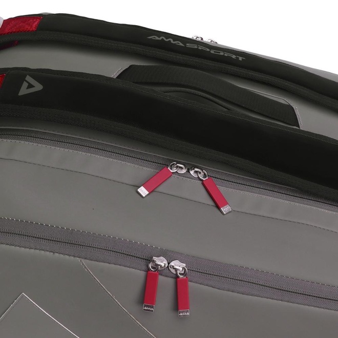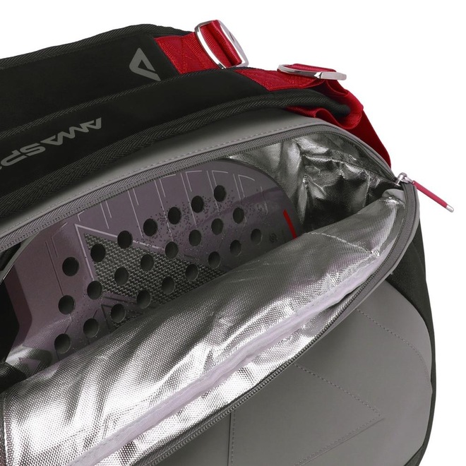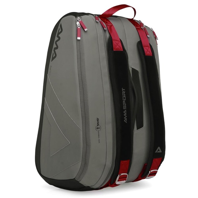 - Detalhamento: Raqueteira dupla com dois compartimentos principais com fechamento em zíper sendo um com proteção térmica que juntos comportam até 9 raquetes de beach tennis sem capa ou 5 raquetes de padel sem capa. Mais dois compartimentos menores com divisórias para boa organização de acessórios. Tecido lateral e superior em Couro PU Premium com toque suave e base em couro antiderrapante que garante alta durabilidade e resistência à sujeira, alças com regulagem e acolchoadas para transporte no ombro ou como mochila, além da alça de mão. Escrita Ama em ambos os lados e assinatura do jogador Hugo Russo;