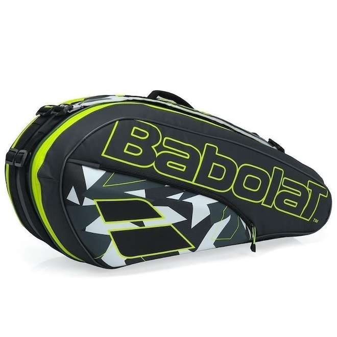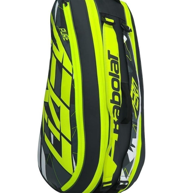 Raqueteira Babolat Pure Aero Rh X6 - 6 RaquetesDescrição da Raqueteira Babolat Pure Aero RH X6 e Amarela A Babolat tem escrito constantemente novas páginas na história do Tênis. Hoje ela oferece tecnologias dedicadas a todos os jogadores apaixonados, dos campeões aos iniciantes. Com a credibilidade de uma importante marca internacional focada em artigos de Tênis, a Raqueteira Babolat Pure Aero RH X6 e Amarela, é essencial para quem deseja guardar seus equipamentos com segurança, conforto e muito estilo. Conta com 2 compartimentos principais que comportam, no total, até 6 raquetes. Conheça as características da Raqueteira Babolat Pure Aero RH X6 e Amarela - Perfil: Tennis; - Material: 40% Poliéster reciclado, 25% PVC, 15% PE, 10% EVA, 5% TPE e 5% Poliéster Virgem; - Detalhamento: Raqueteira dupla, comporta até 06 raquetes sem capas, dois compartimentos principais com fechamento em zíper, sendo um deles térmico. Dois bolsos nas laterais, e um bolso ventilado para tênis ou itens sujos e/ou úmidos. Alça de mão para dar mais possibilidades de transporte e com isso mais conforto, alças de ombro ajustável e suavemente acolchoada. Escrita Babolat em uma das laterais e na outra lateral escrita Aero; - Garantia do fabricante: Contra defeito de fabricação; - Origem: Importado.ref: M0YYZ4