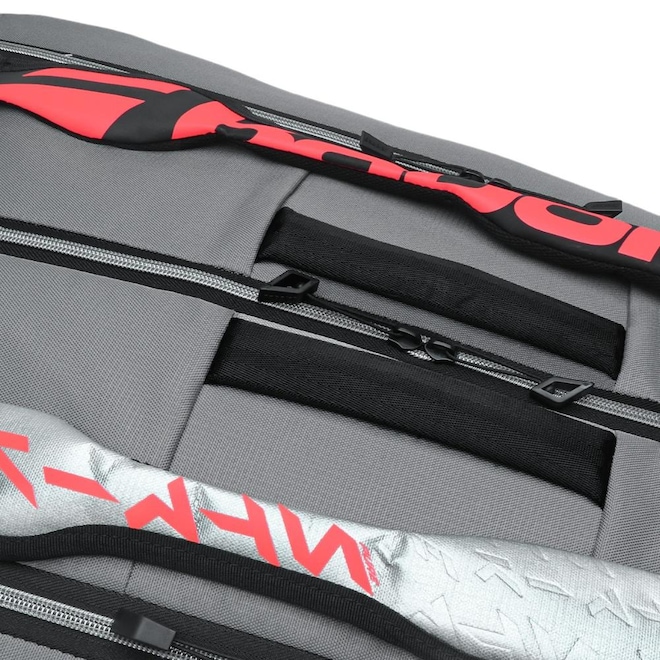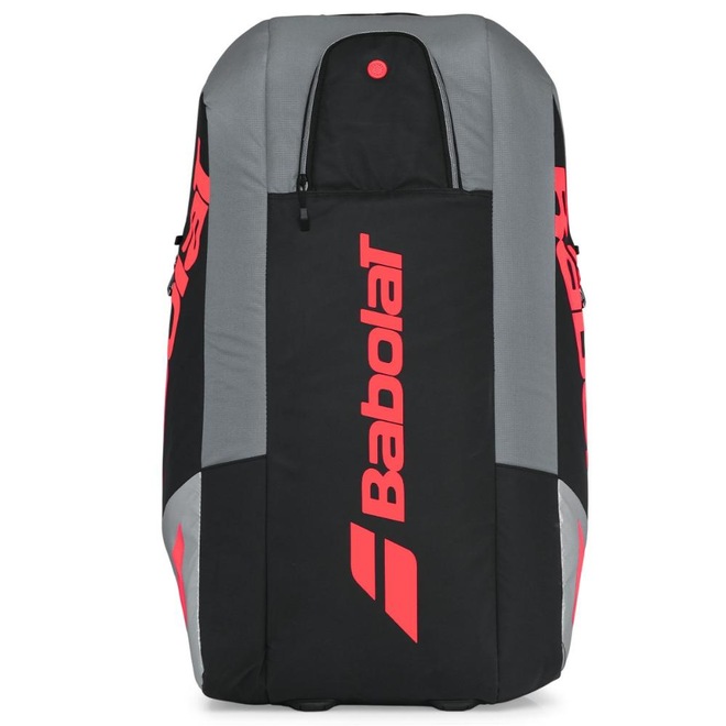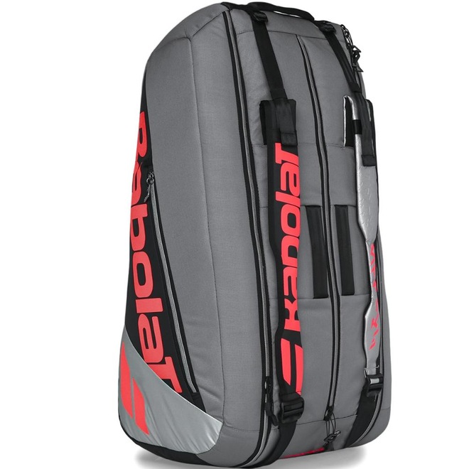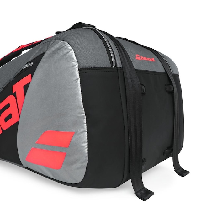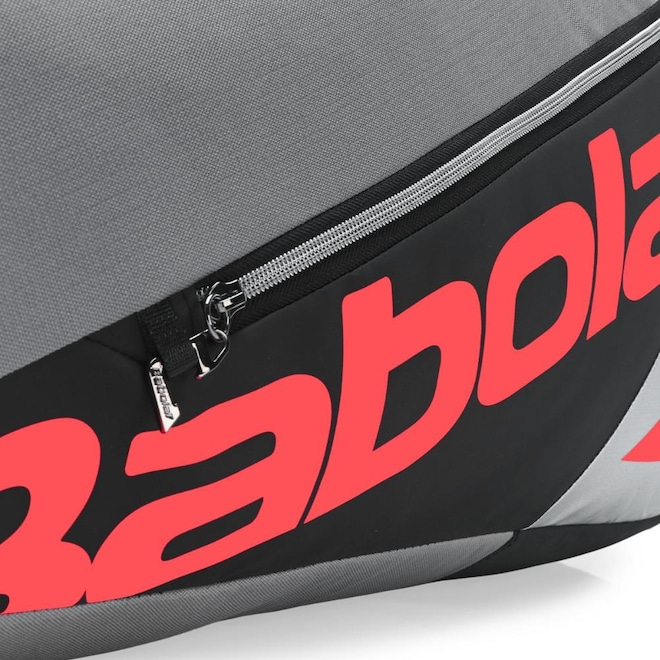 - Detalhamento: Capacidade para até 9 raquetes sem capa. Possui três compartimentos principais com fechamento em zíper, dois bolsos laterais com fechamento em zíper, um deles com divisória interna para melhor acomodação de objetos pequenos. Conta com um compartimento separado para calçado ou roupas molhadas. As alças acolchoadas e ajustáveis tipo mochila também funcionam como alças de mão, além de uma alça reforçada no topo. Visor de identificação. Escrita Babolat estampada nas laterais do produto.