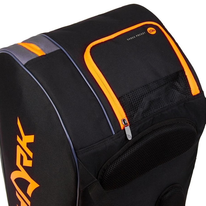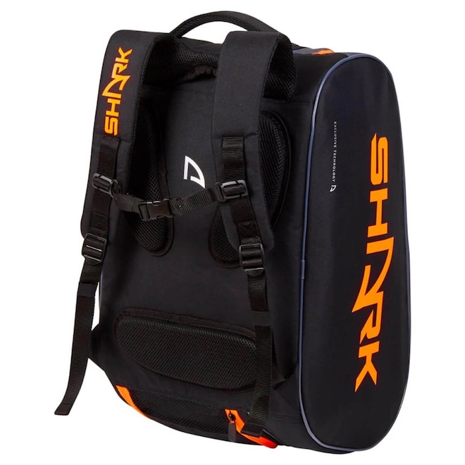 A Raqueteira Shark Beach Tennis, possui alça acolchoada para facilidade de transporte, divisórias laterais para acessórios e compartimento para calçados.