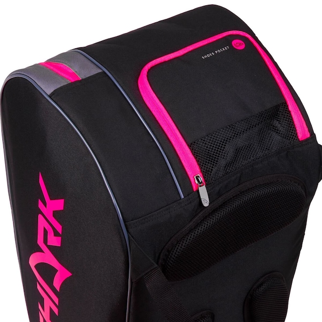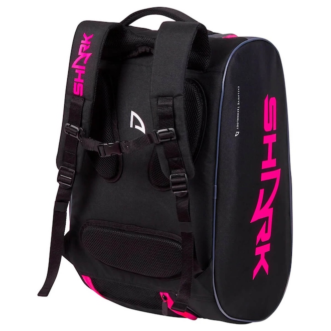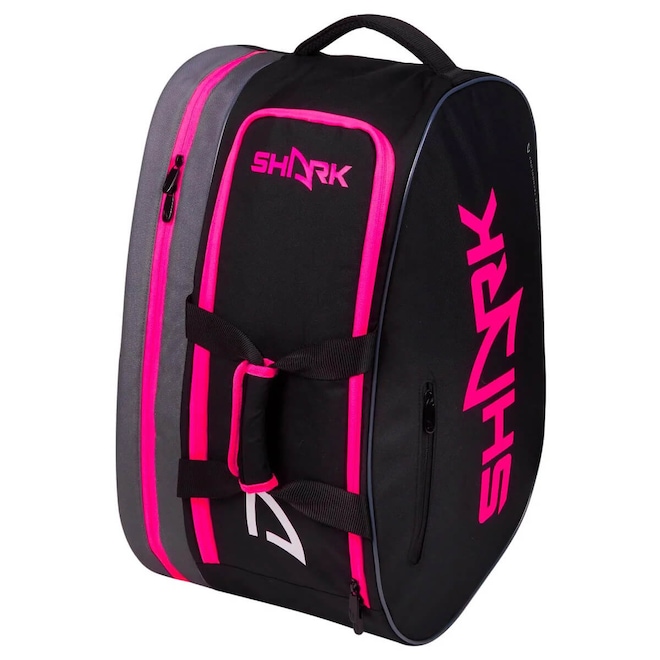 A Raqueteira Shark Beach Tennis, possui alça acolchoada para facilidade de transporte, divisórias laterais para acessórios e compartimento para calçados.