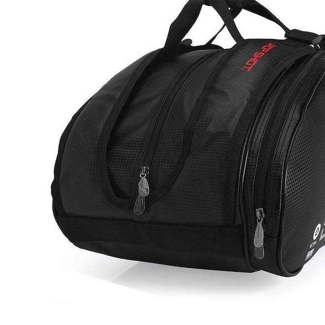 - Detalhamento: Raqueteira dupla, comporta até 8 raquetes de beach tennis sem capa ou 5 raquetes de padel, ambas sem capa, dois compartimentos principais com fechamento em zíper, alça de mão, alça de ombro ajustável e acolchoada