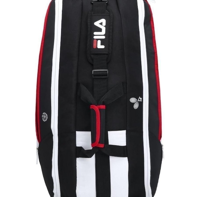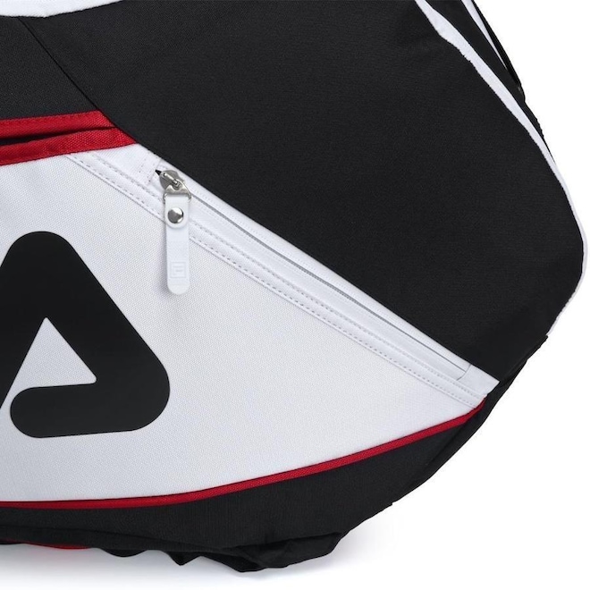 Conheça as características da Raqueteira Fila Vincitori e - Perfil: Tennis - Material: 100% Poliéster - Detalhamento: Um compartimento com fechamento em zíper que comporta até 9 raquetes sem capa, um compartimento térmico, bolso para armazenar roupa molha e/ou calçados, um bolso externo em cada lateral com fechamento em zíper, alça regulável, escrita Fila nas laterais - Garantia do fabricante: Contra defeito de fabricação - Origem: Importado.